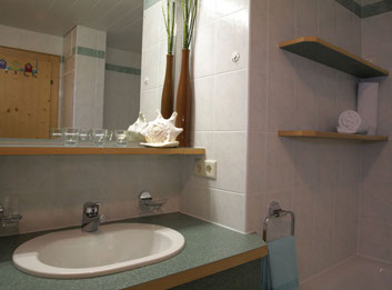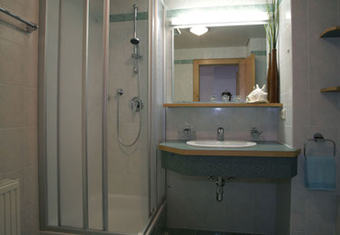 Dusche, Badewanne, Waschbecken, WC, Haarföhn.